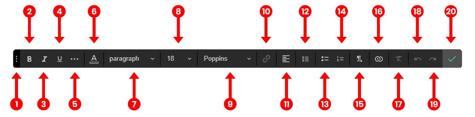 Tekstityökaluilla voit muuttaa Leipäteksti- tai Otsikko-widgetin tyyliä. Vaihda fonttia, väriä, tasausta tai tekstityyliä yksinkertaisen muokkaustyökalun avulla. Voit tehdä hetkessä muutoksia tekstin tyyliin, korostaa avainkohtia ja järjestellä tietoa.